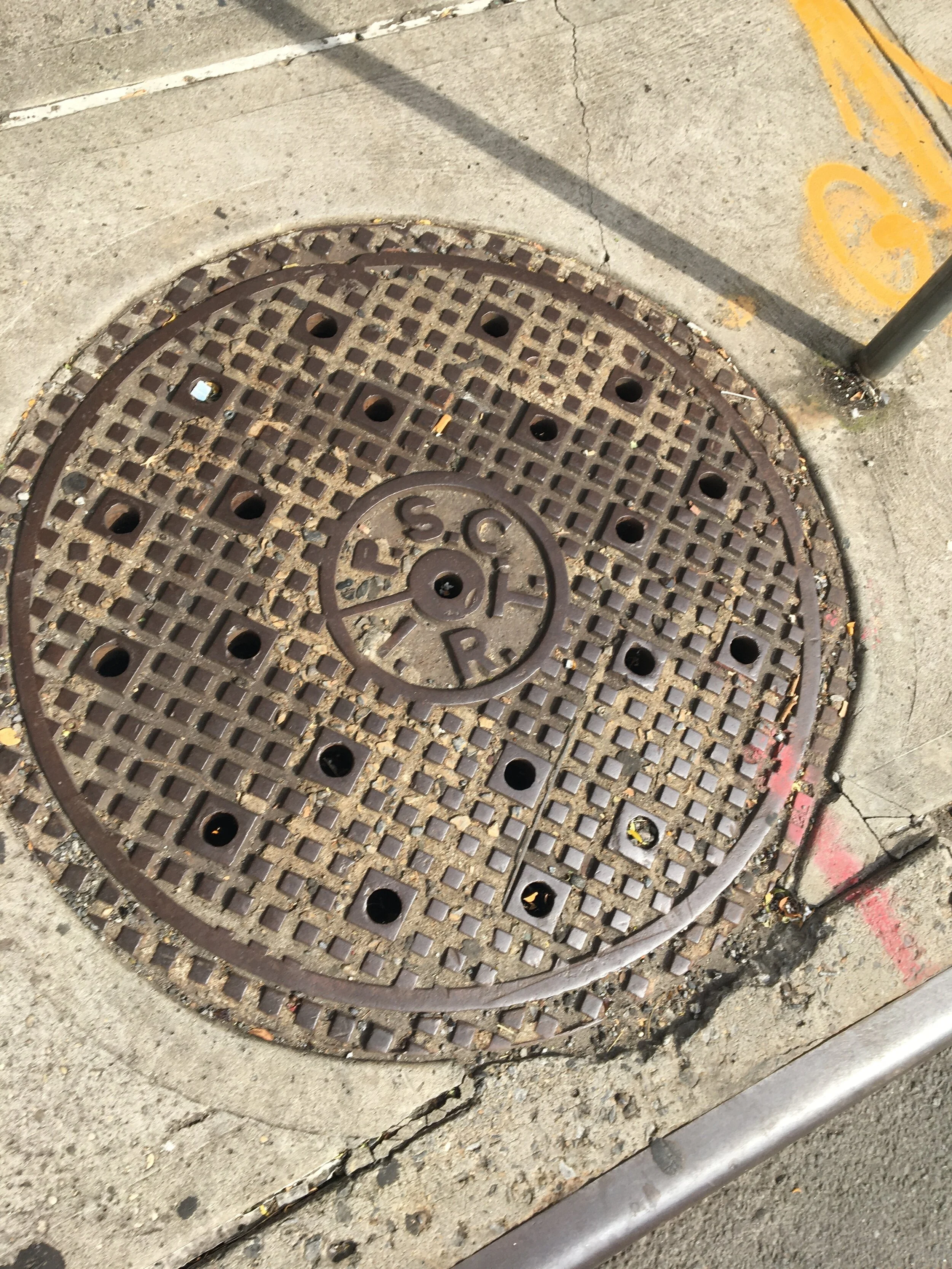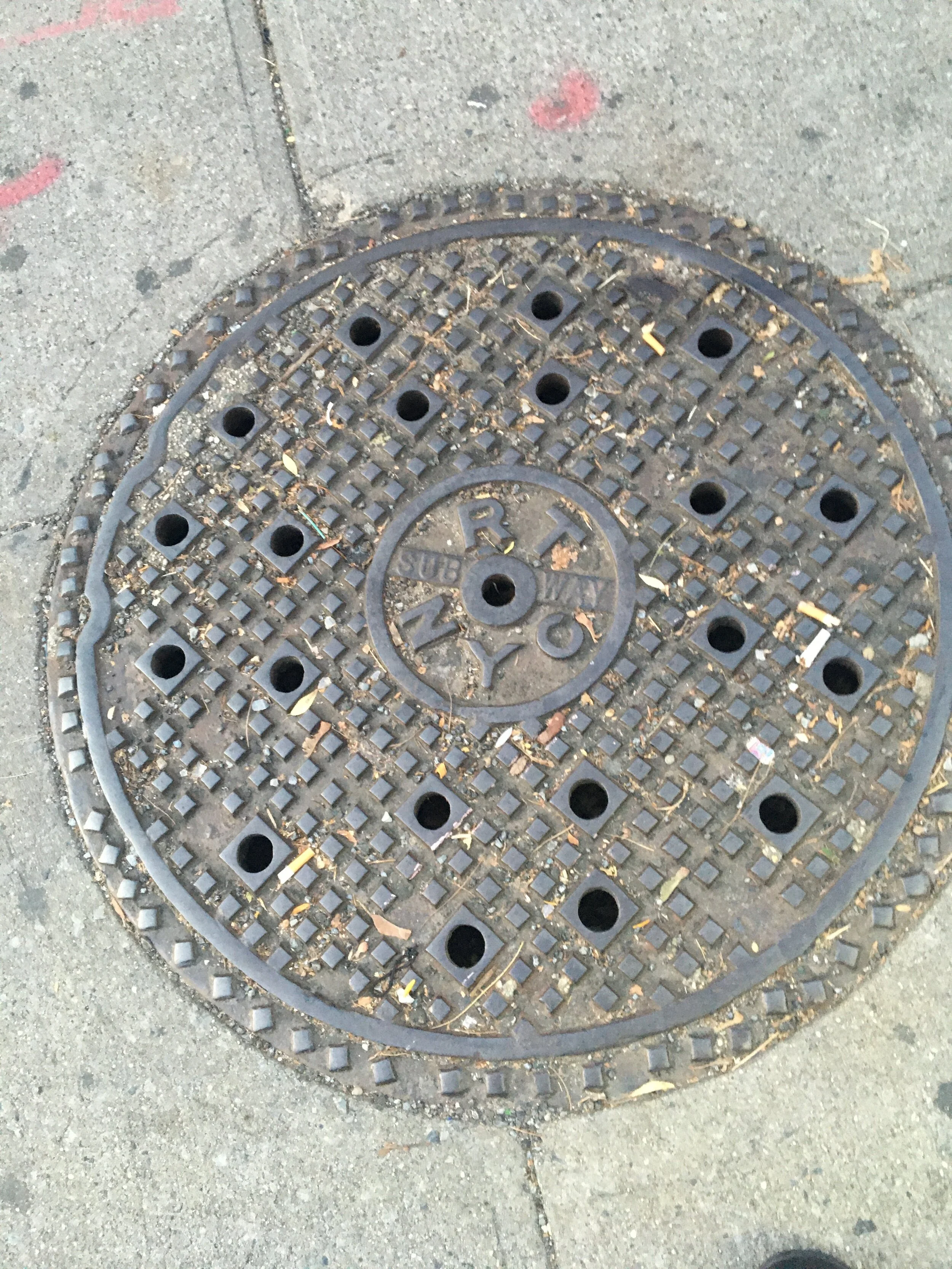 Manhole cover on Flatbush Avenue in Brooklyn. The lettering is P.S.C. I.R.T. for Public Service Commission (of the State of New York), Interborough Rapid Transit The section of the subway opened in 1920 so this manhole cover is at least that old.