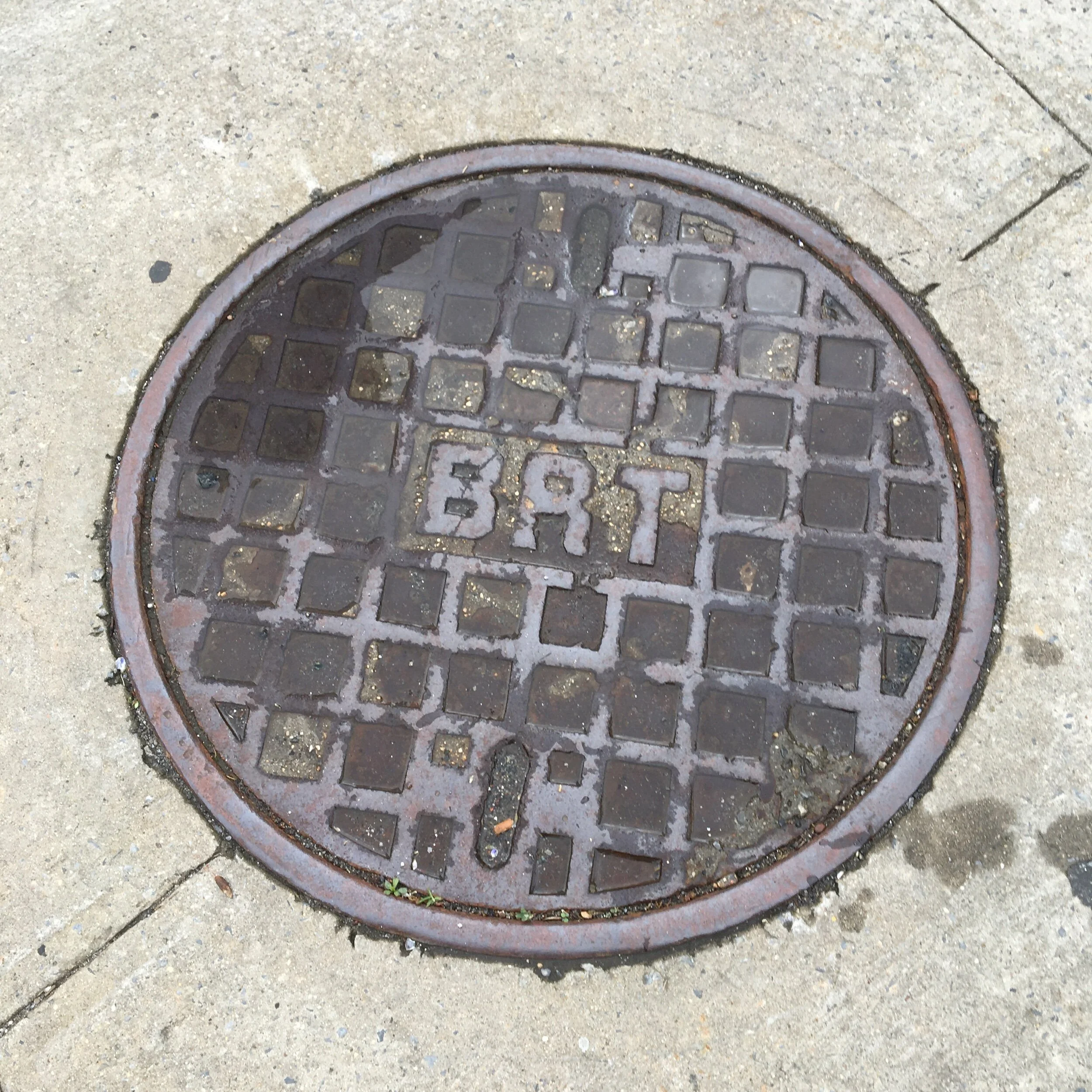 Found on Kent Avenue at Broadway, in the Williamsburg section of Brooklyn. BRT stands for Brooklyn Rapid Transit, the operator of streetcars, elevated lines, and subways in Brooklyn and Queens, and later, Manhattan, that became Brooklyn-Manhattan Transit (BMT) in 1923. This is the first time I’ve seen a BRT manhole cover. The BRT electrified its elevated and surface lines between 1900 and 1905. Before the BRT’s Broadway elevated was extended across the Williamsburg Bridge to Manhattan in 1908, it terminated at the Broadway Ferry at Kent Avenue. This portion of the line stood until 1941. I think this manhole dates from the original electrification of the Broadway elevated. Once again, history lies in plain sight.