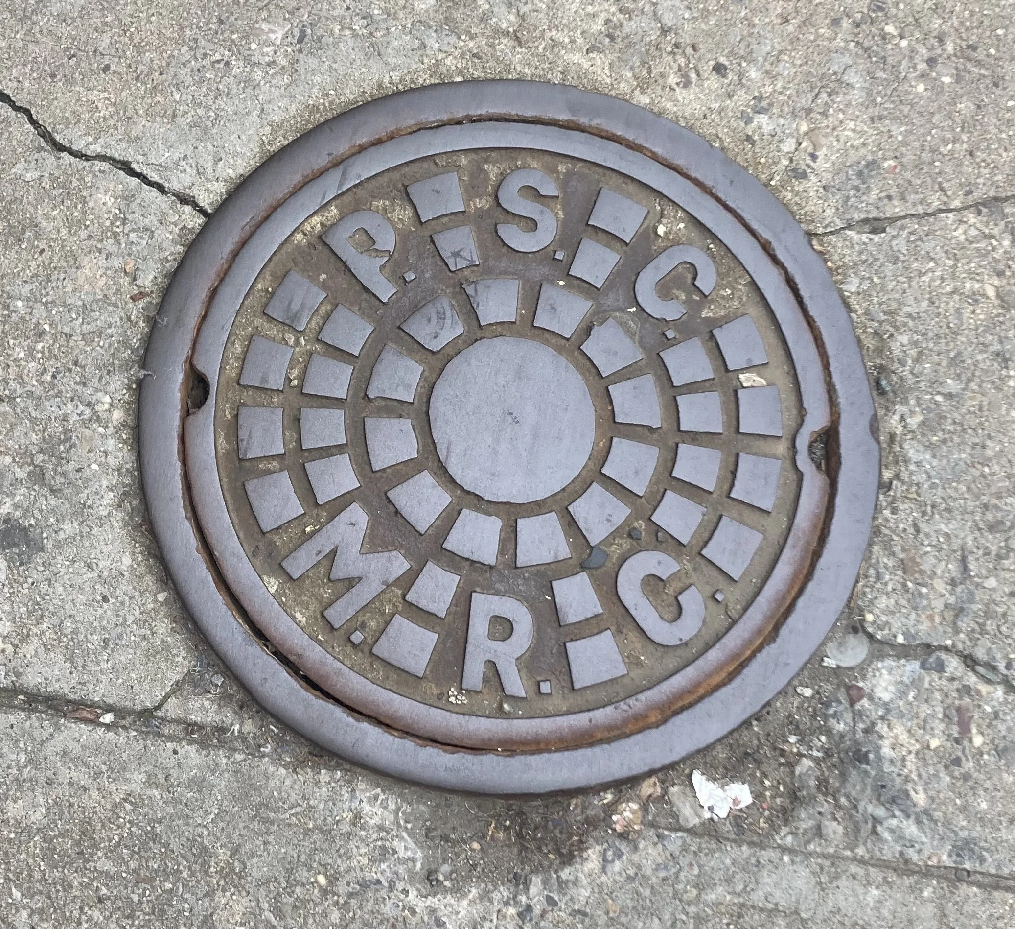 Subway manhole in Brooklyn, on Metropolitan Avenue between Union Avenue and Lorimer Street. The inscription stands for Public Service Commission - Municipal Railway Corporation. This section of the Canarsie subway dates from 1924.