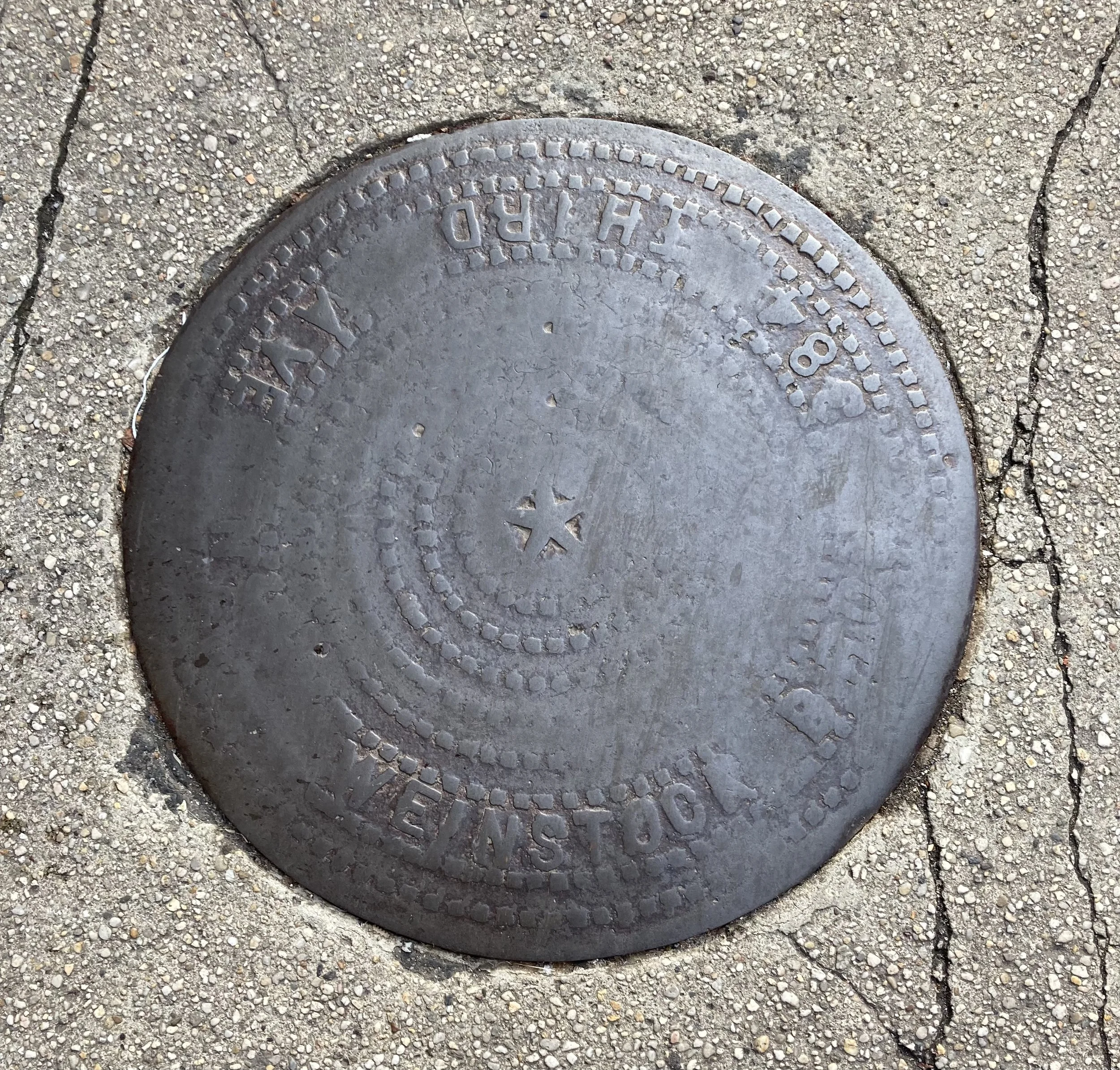 Coal chute cover on Broadway between 17 and 18 Streets in Manhattan. Weinstock Bros. was a hardware store that supplied coal chute covers. Go to Weinstock Bros. Hardware - Walter Grutchfield for some history. This cover dates from the 1910s or 1920s.